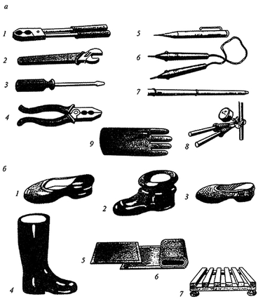 Рис. 4.2. Электрозащитные средства для работы в электроустановках напряжением до 1000 В: а — основные средства: 1 — изолирующие клещи; 2 — гаечный ключ с изолирующими рукоятками; 3 — отвертка с изолирующими рукоятками; 4 — пассатижи с изолирующими рукоятками; 5, 6, 7 — указатели напряжения; 8 — токоизмерительные клещи; 9 — перчатки диэлектрические; б — дополнительные средства: 1 — галоши диэлектрические; 2 — боты диэлектрические; 3 — туфли антистатические; 4 — сапоги диэлектрические; 5 — диэлектрический ковер; 6 — диэлектрическая дорожка; 7 — изолирующая подставка.