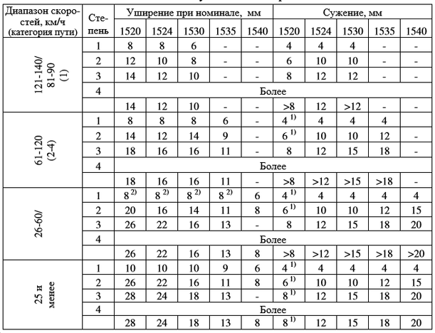Примечание : 1) Для участков с железобетонными шпалами выпуска до 1996г – допуск увеличивается на 2 мм. 2) Для участков со скоростями движения поездов до 50 км/ч - 10 мм 3) При ширине колеи от 1510 мм до 1512 мм и более 1548 мм до 1550 мм скорость ограничивается до 15 км/ч. При ширине колеи менее 1510 мм и более 1550 мм движение поездов закрывается