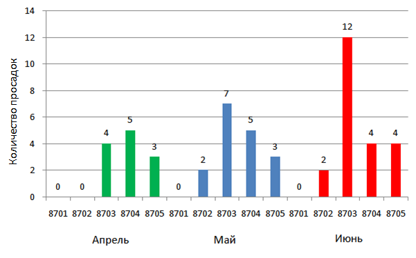 Рисунок 3.12 Количество отступлений по просадкам пути на 8701-8705 километрах в 2016 году