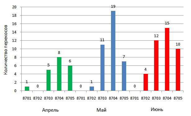 Рисунок 3.11 Количество отступлений по перекосам пути на 8701-8705 километрах в 2016 году.