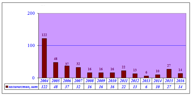 Рисунок 3.9 Количество километров с неудовлетворительной оценкой с 2004 по 2016 годы.