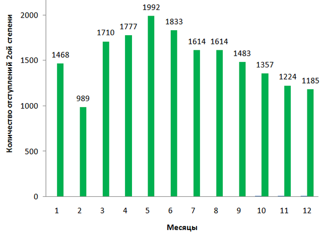 Рисунок 3.4 Количество отступлений 2 степени по месяцам в 2016 году
