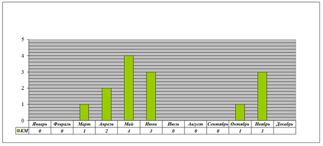 Проанализировав данные, представленные в таблицах 3.1 и 3.2, а также приведенные рисунки, видно, что наиболее неблагоприятным по количеству отступлений, является апрель (1777 отступления: перекосы, просадки, рихтовка), май (1992 отступлений: рихтовка, перекосы, уширение, просадка, уровень), и июнь (1833 отступлений: рихтовка, перекосы, уширение, просадка).