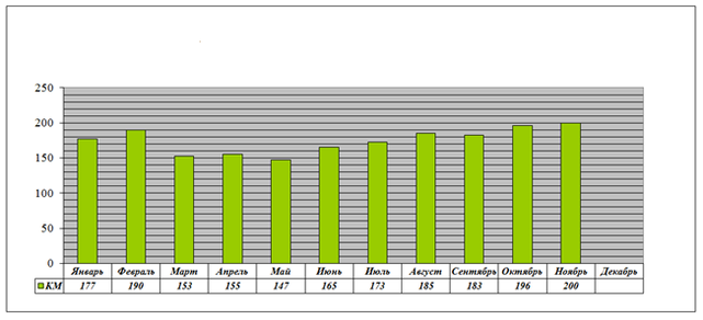 Рост просадок наблюдается также в марте, июле, августе, сентябре и октябре месяцах. В каждом месяце наблюдаются отступления по рихтовке и перекосам пути. Рост уширений наблюдается также в январе , июле, августе , сентябре , октябре ,ноябре и декабре.