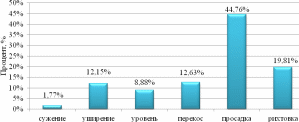 Можно сделать вывод о том, что самое большое количество отступлений приходится на следующие виды отступлений: перекос (12,63%), просадку (44,76%) и рихтовку (19,81%).