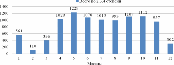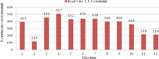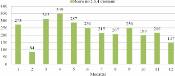 Рис. 3.8. Количество отступлений просадок 2, 3, 4 степени по месяцам 2016 года