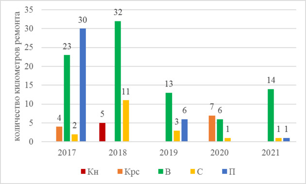 Вывод: Проанализировав данные таблиц 2.2 и 2.3,а так же построенную по ним диаграмму 2.5, можно сделать вывод о том, что по главному направлению пути Пивань-Совгавань в течении 5 лет необходимо сделать 16 км капитального ремонта пути, 88 км планово-предупредительного ремонта пути, 18 км среднего ремонта пути, 37 км подъемочного ремонта пути. На текущий 2017 год необходимо выполнить по направлению Пивань-Совгавань: 4 км капитального ремонта пути, 23 км планово-предупредительного ремонта пути, 2 км среднего ремонта пути и 30 км подъемочного ремонта пути.