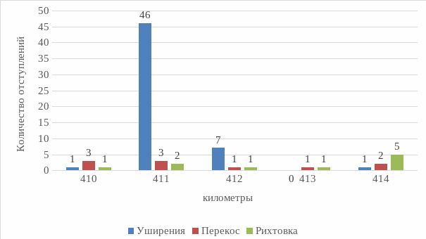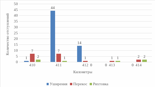 Рисунок 3.5 Количество отступлений за июль на 410-414 км в 2016 году. Направление Пивань - Совгавань