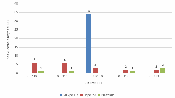 Вывод: Была проанализирована балльность и оценка состояния пути по околоткам за 2016 год. Наихудшим околотком по состоянию пути является ПД-4. Проанализировав по ПУ 32 (по ведомостям прохода вагона путеизмерителя) по всем видам отступлениям за год: просадке, рихтовке, перекосам, наибольшее количество отступлений наблюдается в месяцах: июле, августе и сентябре. По этим видам отступлений для июля, августа и сентября для 410-414 км пути околотка номер 4 были построены диаграммы. Из них видно, что наихудшее состояние пути на 411-412 км. Для этих километров, в последующем разделе дипломной работы разрабатываю технологический процесс планово-предупредительного ремонта пути.