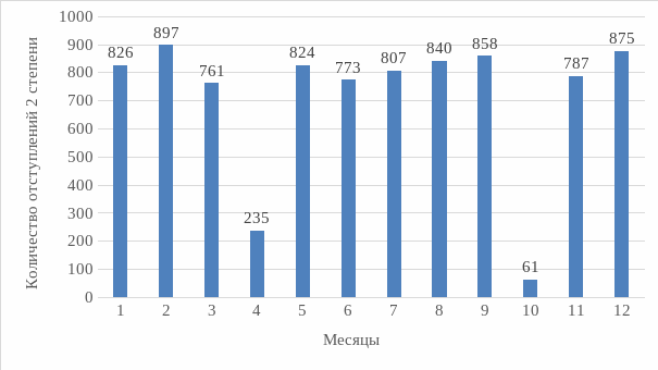 Рисунок 3.4 Количество отступлений 2 степени по месяцам в 2016 году