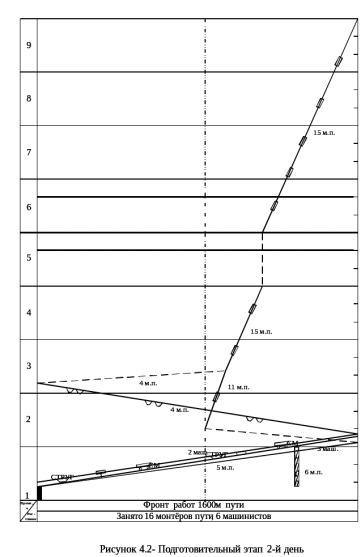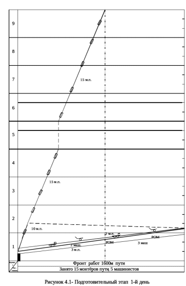 В первый день продолжительность технологического «окна» 1 час 40 минут. С 8 00 до 8 14 производится оформление закрытия перегона. В 8 часов утра 4 монтера пути начинают снимать пикетные знаки, а 6 монтеров пути разбирают постоянный железобетонный настил и укладывают временный переездный. Машина РОМ-3 очищает рельсы и скрепления от грязи и мазута, 3 монтера пути краном мотовоза выгружают контейнеры со скреплениями для всего участка работ,2 монтера пути развозят скрепления по местам смены на однорельсовой тележке. После чего 5 монтеров пути с развозки скреплений и 6 монтеров пути с разборки и укладки переездного настила начинают с 9 25 смену дефектных скреплений. Машина СМ-2 убирает мусор и грязь с пути на всем фронте работ. СТРУГ СС-1 производит очистку кюветов. После снятия пикетных знаков 4 монтера пути занимаются устройством выходов из кюветов, а завершив эту работу, помогают 11 монтерам пути менять дефектные скрепления. После обеда 15 монтеров пути заканчивают смену дефектных скреплений на оставшемся участке.
