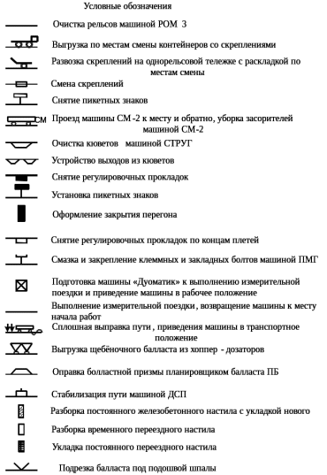 Мотовозом МПТ с участием 4-х монтером пути производится погрузка контейнеров со скреплениями и смененных шпал. Завершив работу с ХД, два монтера до обеденного перерыва начинают установку пикетных знаков, а освободившиеся 4 монтера, работающие с мотовозом МПТ, укладывают постоянный переездный настил. В связи с необходимостью уложить постоянный переездный настил время обеда смещено: начало обед 12ч.38, окончание -13ч.38мин. После обеда 4 монтера, освободившиеся после укладки переездного настила, производят подрезку балласта под подошвой рельсов ,двое заканчивают установку пикетных знаков и помогают выполнять подрезку балласта под подошвой рельсов.
