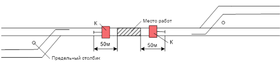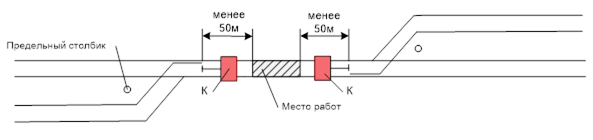 Если какие-либо из этих стрелочных переводов направлены остряками в сторону места работ и не имеют возможности изолировать путь, то такое место с обеих сторон ограждается переносными красными сигналами, устанавливаемыми на расстоянии 50 м от границ участка работ.