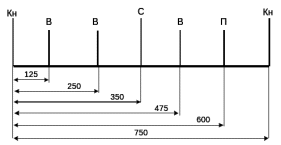 На рисунке 2.2 показана ремонтная схема для пути нечетного направления «2В2», представленного бесстыковой конструкцией на железобетонных шпалах. Для данного пути в интервале между капитальными ремонтами необходимо выполнить пять промежуточных ремонтов. Учитывая более длительный срок службы данного пути между капитальными ремонтами, интервалы между промежуточными ремонтами принимаются дифференцированно в интервале от 100 до 125 млн. т.