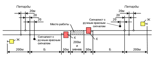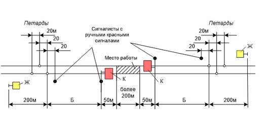 Переносные сигналы уменьшения скорости и петарды должны находиться под охраной сигналистов, стоящих с ручными красными сигналами в 20 м от первой петарды в сторону места работ. Переносные красные сигналы должны находиться под наблюдением руководителя работ.