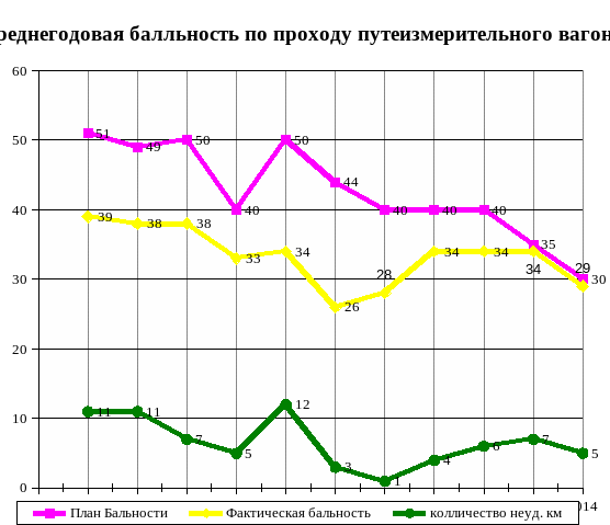 Балловая оценка состояния пути за 11 месяцев 2014 г. при плане 30 баллов составила 29 баллов. При этом допущено 5 неудовлетворительных километров. По сравнению с 11 месяцами 2013 года (план - 35 баллов, выполнение - 34 балла, 6 неуд. км) балловая оценка снизилась на 5 баллов, количество неудовлетворительных километров уменьшилось на 1 км.