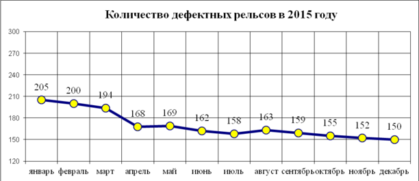 Диаграмма количества дефектных рельсов в 2015 году приведена на рис. 1.4.