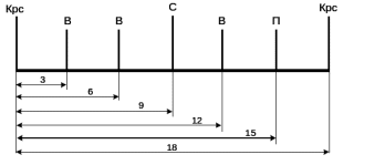 На рисунке 2.2 показана ремонтная схема для пути 3Г4, представленного звеньевой конструкцией. Для данного пути нормативный тоннаж между капитальными ремонтами составляет 600 млн. тонн. Для данного пути интервалы между промежуточными ремонтами принимаются 150 млн. т.