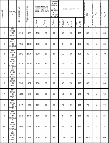 Все данные расчета возвышений и длин переходных кривых сведены в таблице 3.3.