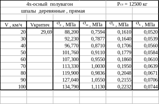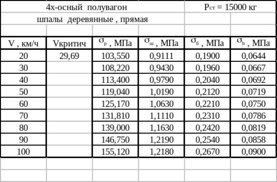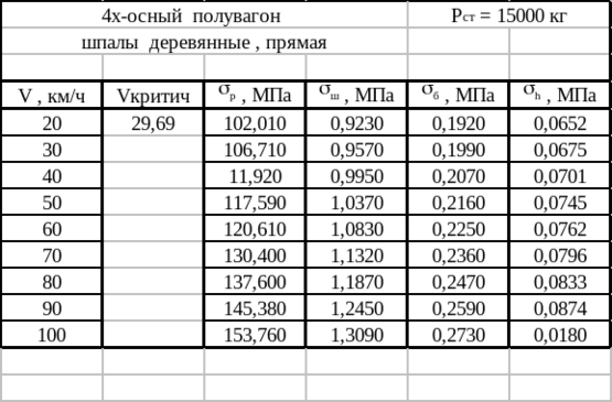 Помимо выполненного расчета, на ЭВМ произведен расчет для четырехосного полувагона с Рос= 25 т/ось, а также с Рос= 30 т/ось для пути на деревянных шпалах для прямой, с различными модулями упругости подрельсового основания учитывая то, что линия железной дороги может проходить на участках со слабыми основаниями. Как показывают расчеты при увеличении осевой нагрузки резко возрастают напряжения на основную площадку земляного полотна, что превышает допускаемые значения при скорости 80 км/ч, в том случае если участок расположен на слабом основании при осевой нагрузки 30 тонн на ось значительно увеличиваются напряжения в рельсах. В этом случае требуется усиление верхнего строения пути. Результаты расчетов приведены в таблицах 1.10 – 1.15.