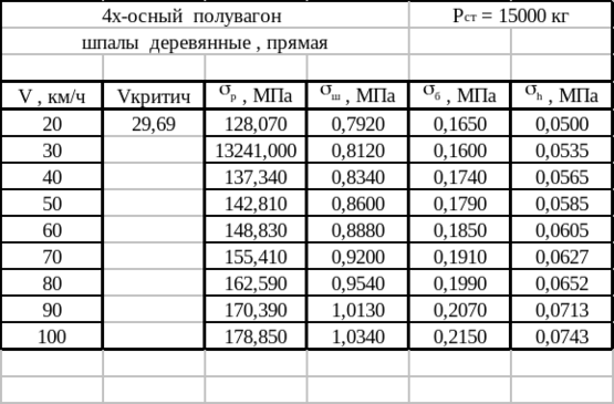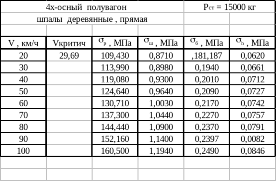 Расчет выполнен для прямого участка пути. Дополнительные характеристики верхнего строения пути для расчета выписаны из [1, приложение III-7, стр.149 ]: А = 0,235; С1 = 0,223; С2 = 0,110.