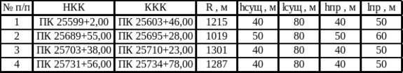 Расчет возвышений и длин переходных кривых для всех круговых кривых выполнен в табличной форме и представлен в таблице 2.1.