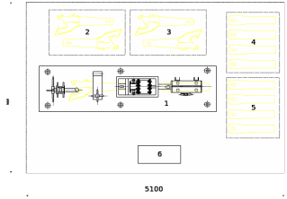 Рисунок 3.4.2 - Планировка рабочего места дефектоскописта: 1 - установка для неразрушающего контроля с системой нагружения; 2 - рабочее место оператора; 3 - зона накопления корпусов автосцепки перед контролем; 4 - зона накопления корпусов автосцепки после контроля; 5 - зона накопления тяговых хомутов перед контролем; 6 - зона накопления тяговых хомутов после контроля.