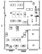 Рисунок 3.2.1 - Планировка участка по ремонту автосцепного устройства ВЧДР Хабаровск АО «ВРК-1»: 1 - станок токарно-винторезный 1М63И-1; 2 - автомат наплавки пятника; 3 - транспортная тележка; 4 - заточной станок; 5 - стол-верстак; 6 - стол-верстак; 7 - печь для прокалки электродов; 8 - установка феррозондовая для контроля автосцепки; 9 - площадка накопления корпусов автосцепок в ремонт; 10 – площадка накопления корпусов отремонтированных автосцепок; 11 - площадка накопления забракованных корпусов автосцепок; 12 - стол-верстак; 13 - стенд карусельный; 14 - установка магнитопорошковая для контроля автосцепки; 15 - станок фрезерный вертикальный 1М65-1; 16 - станок фрезерный горизонтальный 6Т83-1; 17 - станок для обработки шипа в корпусе; 18 - сварочная кабина; 19 - Станок вертикально-сверлильный 1М65-1; 20 - Устанобка магнитопорошковая для контроля тяговых хомутов; 21 - Стенд манипулятор для контроля тяговых хомутов; 22 - Пресс разборки-сборки поглощавших аппаратов Ш-1-Т, Ш-1-ТМ; 23 - Площадка для обмера деталей поглощавших аппаратов и тяговых хомутов; 24 - пресс разборки-сборки поглощавших аппаратов Ш6-Т0-4; 25 - площадка накопления деталей в ремонт; 26 - площадка накопления деталей после ремонта; 27 - площадка накопления забракованных деталей; 28 - станок фрезерный горизонтальный 6Т83-1; 29 - станок токарный 1М63Н; 30 - станок токарно-винторезный 7Т5-1; 31 - ящик хранения инструментов и метизов; 32 - комната приема пищи; 33 - комната мастера и бригадиров; 34 - кран подвесной однобалочный; 35 - комплекс для нагрева хвостовика автосцепки.