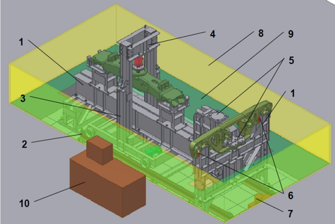 Рисунок 3.3.1 - Общий вид установки: 1– несущая металлоконструкция; 2 – рельсовое полотно; 3 – тележка главного пресса; 4 – главный пресс; 5 – рычаг передачи усилия в рессорный проем боковой рамы; 6 – Модули распорных гидроцилиндров (2 шт); 7 – Гидростанция; 8 – Ограждение рабочей зоны установки; 9 – настил приямка; 10 – Рабочее место оператора.