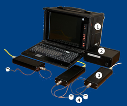 Рисунок 3.3.2 - Комплекс дефектоскопический акустико-эмиссионный ГАЛС-1: 1– управляющий компьютер; 2 – блок синхронизации; 3 – каналы; 4 – ПАЭ.