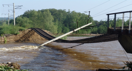 на стадии проектирования и строительства не были учтены меры защиты земляного полотна от водоразмыва при резком подъёме уровня воды в реке Эгоно.