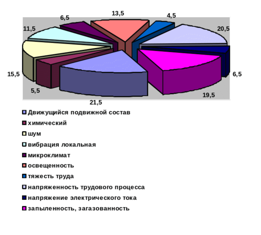 Наиболее часто повторяющимися видами происшествий, приводящими к травмированию со смертельным исходом, в 2015 г. были наезды подвижного состава, поражение электрическим током, дорожно-транспортные происшествия. В компании разработаны и внедрены нормативные документы, определяющие систему управления охраной труда в филиале ОАО «РЖД» Сахалинской железной дороге, перечень основных работ по охране труда, выполняемых руководителями всех уровней управления. Определен и осуществляется порядок выезда руководителей компании и рассмотрения результатов расследования случаев травмирования работников на производстве со смертельным исходом [11]. Характерные для Ремонтного локомотивного депо Южно-Сахалинска вредные и опасные факторы производственной среды представлены на рисунке 1.5.