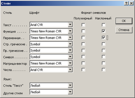 Переменная – курсив (на 2 пт больше базового). Функция и константы – прямой шрифт Сокращения в индексах – прямой шрифт. |