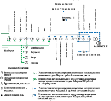 Схема обслуживания станций участка Бира – Хабаровск II маневровыми, вывозными и передаточными локомотивами приведена на рисунке 1.2.