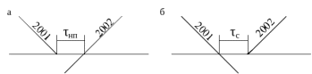 Рисунок 4.1. Интервал для встречных поездов: а – интервал неодновременного прибытия одного поезда с остановкой и проследованием без остановки встречного поезда, б – интервал скрещения поездов.