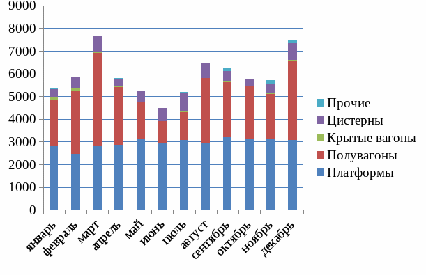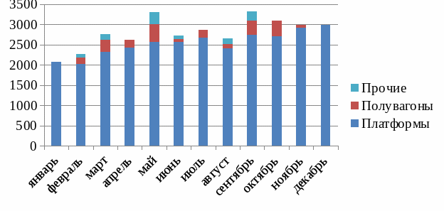 На рисунках 2.1 и 2.2 приведены ежемесячные объемы погрузки и выгрузки с разложением по роду подвижного состава.
