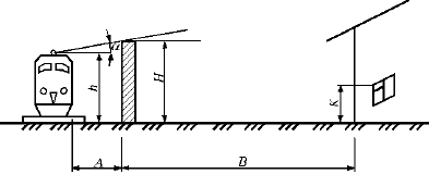 Рисунок 1. Схема для расчета эффективности экрана: а – расстояние от источника шума до экрана; в – расстояние от экрана до защищаемого здания; h – высота источника шума; Н – высота экрана; К – высота точки приема звука
