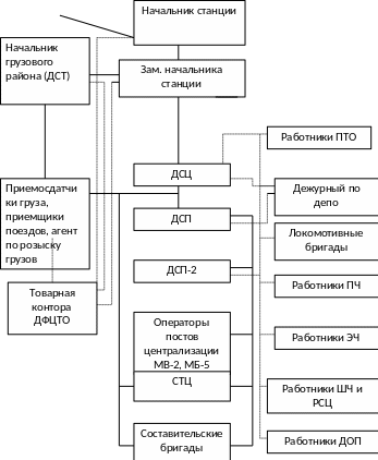 Начальнику станции подчиняются все работники, находящиеся в его штате, в оперативном подчинении находятся работники, принимающие участие в выполнении технологического процесса, но не находящиеся в его штате. Схема оперативного руководства работой станции представлена на рисунке 1.2.