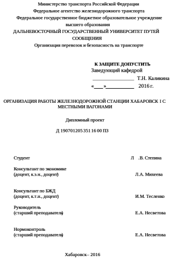 Дипломный проект студентки Степиной Лилии Викторовны на тему «Организация работы железнодорожной станции Хабаровск I с местными вагонами» выполнен в установленные сроки и в соответствии с заданием.