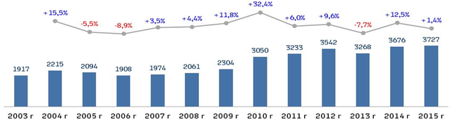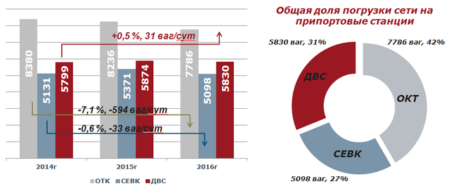 За последние 3 года при общем снижении погрузки в адрес припортовых дорог отмечается увеличение объемов погрузки сети только на Дальневосточную дорогу (рисунок 11). (Рост погрузки составил на 0,5% или 31 ваг с/сут к 2014 году при общем снижении погрузки сети в адрес припортовых дорог на 596 вагонов.)