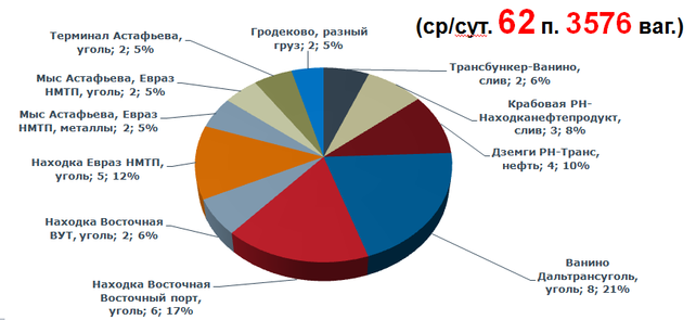 Среднесуточно в 2015 году было отставлено от движения 62 поезда или 3576 вагонов. Основная доля отставленных от движения поездов приходится на основные выгрузочные станции: Ванино – 21%, Находка Восточная – 17 %, Дземги - 10%, Крабовая – 8% (рисунок 9).