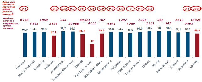 Наихудшие результаты по надежности доставки грузов отмечаются по станциям Рыбники, Ванино, Сов.Гавань, Дземги, где данный показатель не превышает 90% (рисунок 10). За 12 месяцев 2015 года Дальневосточной железной дорогой за нарушение сроков доставки грузов и порожних вагонов в пользу клиентов было выплачено 452,3 млн.руб.