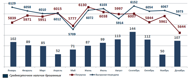 Рисунок 8 – Динамика погрузки в адрес ДВЖД, выгрузки и передачи по погран. переходам, количества отставленных от движения поездов