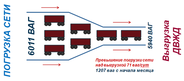Превышение погрузки сети дорог над фактической выгрузкой и передачей по погран. переходам составляет 71 вагон в сутки или 1207 вагонов с начала месяца (рисунок 16).