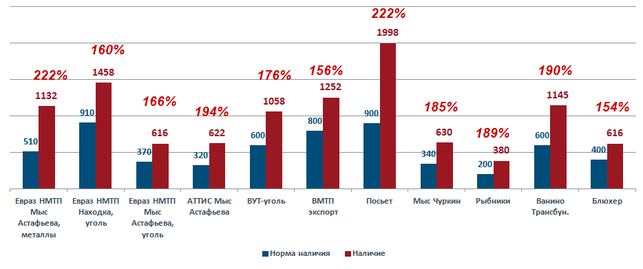 Рисунок 15 – Наличие вагонов в портах Дальневосточной железной дороги к установленной норме