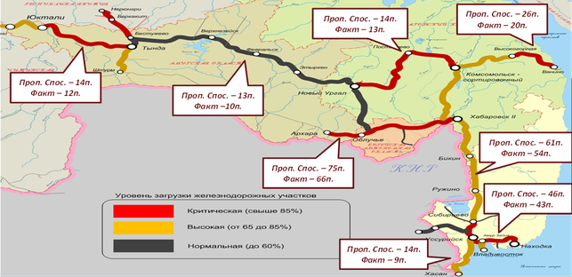 Сегодня с критической (более 85%) загрузкой работают следующие участки: Архара – Хабаровск, Юктали – Тында, Нерюнгри – Бестужево, Новый ургал – Комсомольск, Высокогорная – Ванино, Сиирцево – Находка, Барановский – Хасан (рисунок 17).