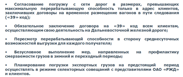 Установить всем получателям реальную норму выгрузки экспортных грузов (перерабатывающая способность, указанная в договоре не должна быть максимально возможным значением выгрузки, должна быть приближена к среднесуточному значению).