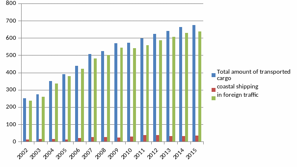 The analysis of the trends in the volume of transshipment of foreign cargoes at the ports from 2002 till 2015 is graphically presented in Figure 1; it shows that there is steady growth in traffic volumes of export cargoes in the mixed traffic through the ports. The share of traffic through the ports has doubled from 250.3 million. tons in 2002 to 673.8 million. tons in 2015.