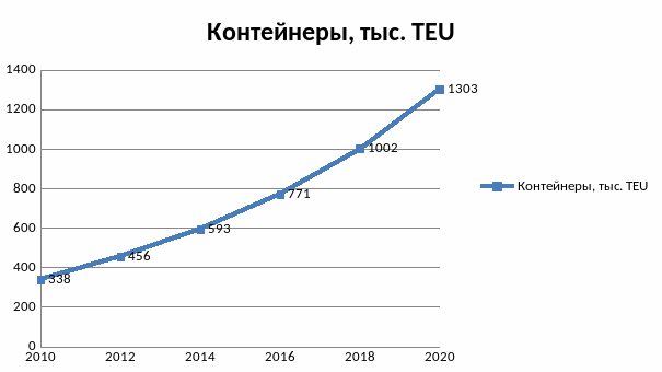 ОАО «Владивостокский морской торговый порт» активно ведет работы по развитию и модернизации своей инфраструктуры и перегрузочного оборудования. На территории «ВМТП» находится ООО «Владивостокский контейнерный терминал» (ВКТ) и ООО «Дальрефтранс». Контейнерооборот за 2012 год составил 456 тыс. TEU, что выше показателей 2010 года на 26%. Грузооборот ООО «ВКТ» за 2014 год составил 593 тыс. TEU. Возрастание потока контейнерных грузов показано на рисунке 8 (если процентный рост останется равным 30%). В экспортном направлении ВКТ обработал 163 тыс. TEU, в импортном -204 тыс. TEU, в каботаже – 109 тыс. TEU [44].