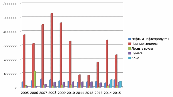 Для определения передаваемого грузопотока с ОАО «ВМТП» на терминал «сухой порт» необходимо проанализировать объемы выгрузки и погрузки грузов и выявить их динамику за 10 лет работы порта с 2005 по 2015 гг. [53]. Данные представлены в Приложении 2. Анализ же динамики показан на рисунке 14 и рисунке 15.